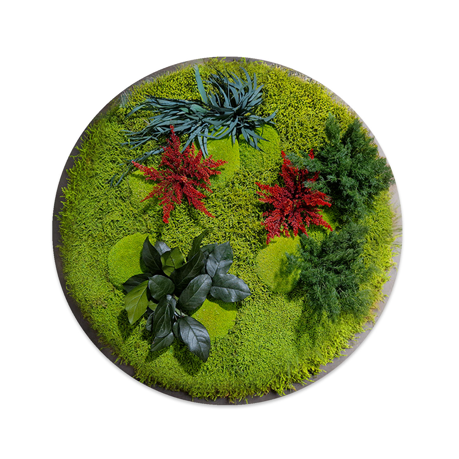 • rundes Moosbild mit Moosen und verschiedenen Pflanzen