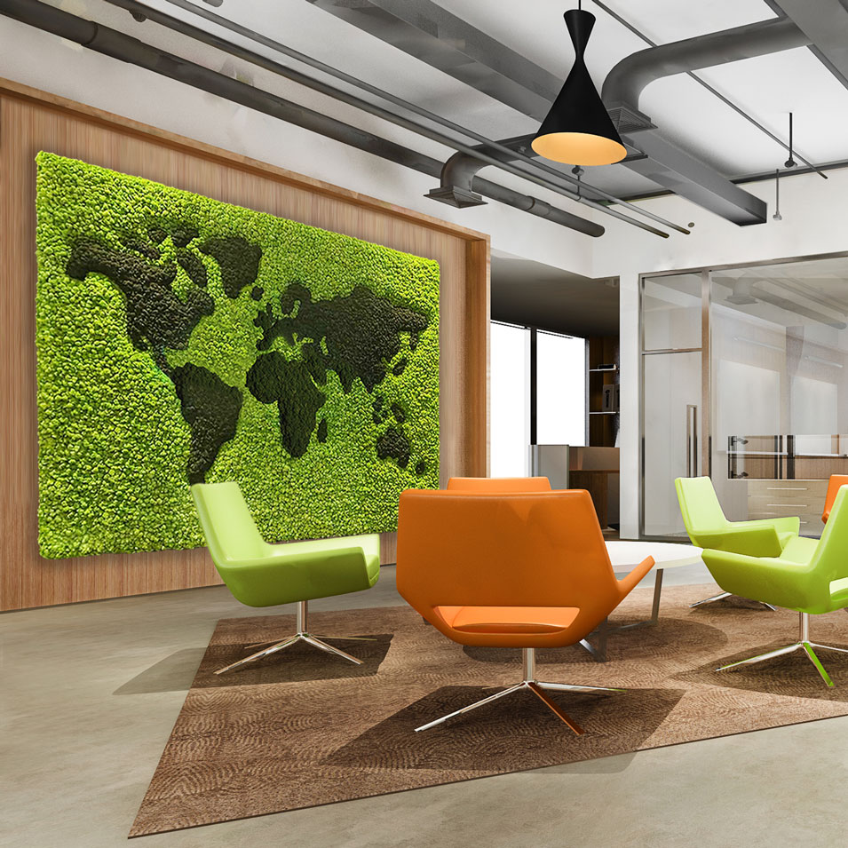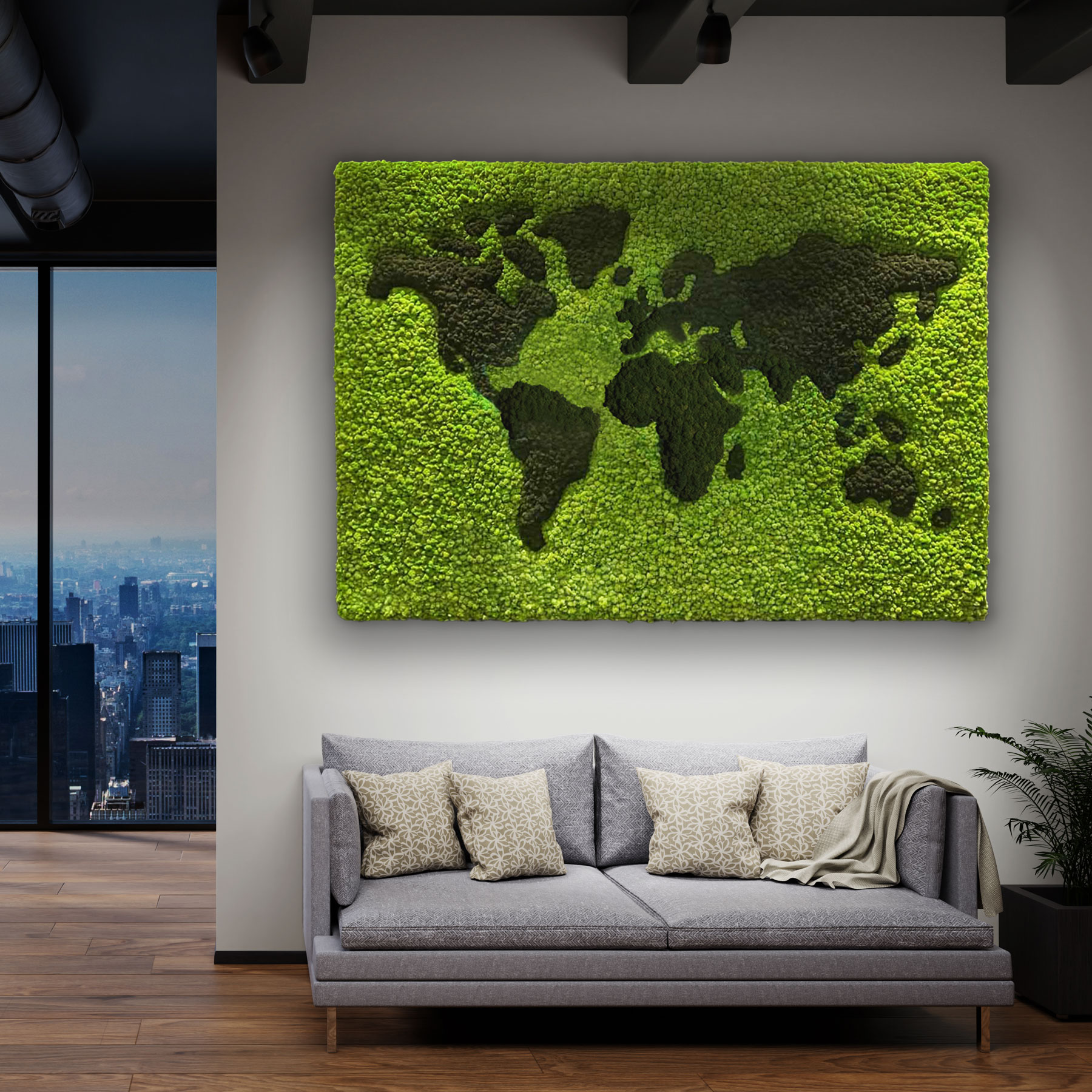 Ob im Wohnzimmer, Büro, Hotel oder Empfangsbereich – die Moos-Weltkarte setzt moderne, stilvolle Akzente und inspiriert täglich zu neuen Abenteuern.