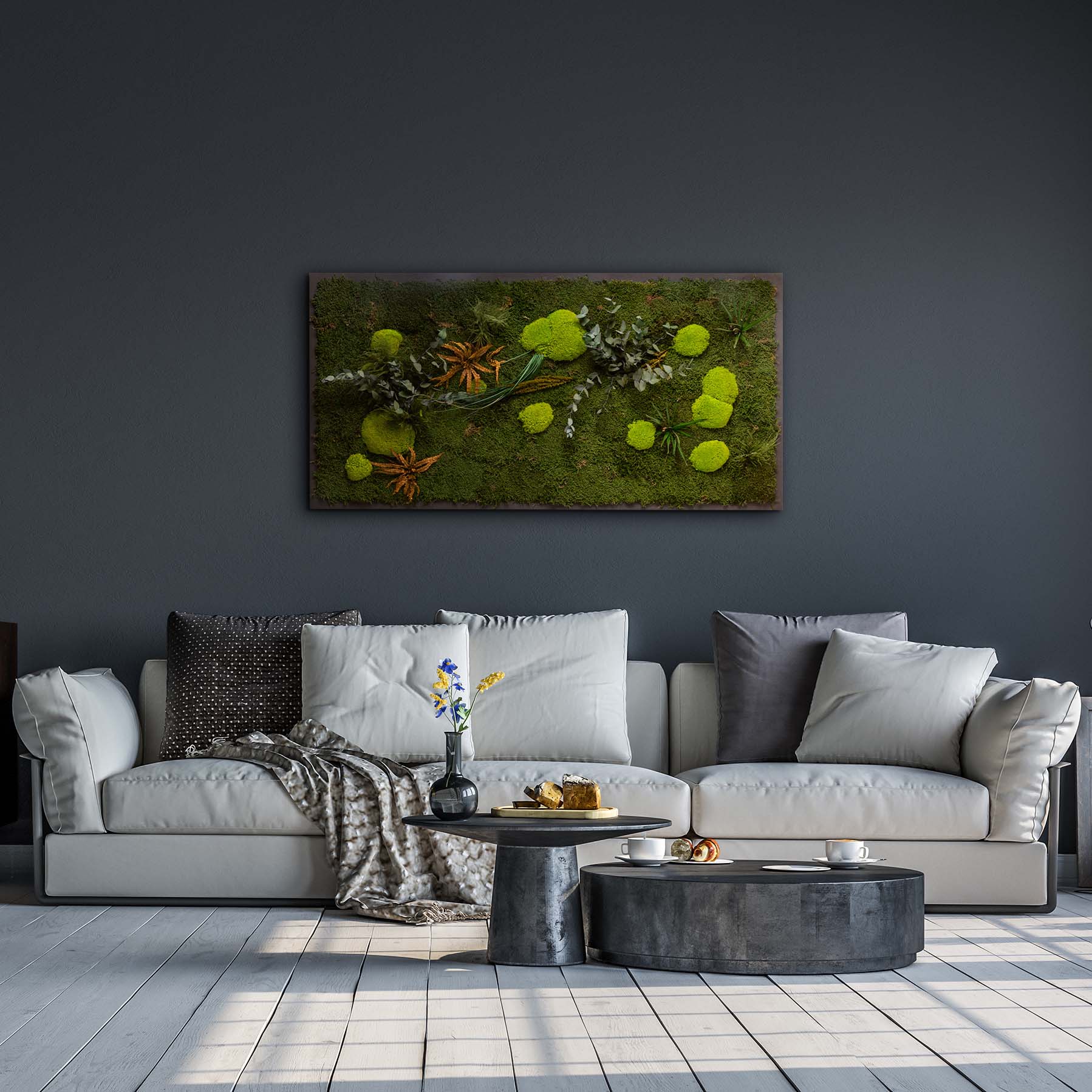 Das Moosbild wird aus 100% echtem und natürlichen, konservierten Kugelmoos / Ballenmoos, Waldmoos / Flachmoos & echten konservierten Pflanzen gefertigt.