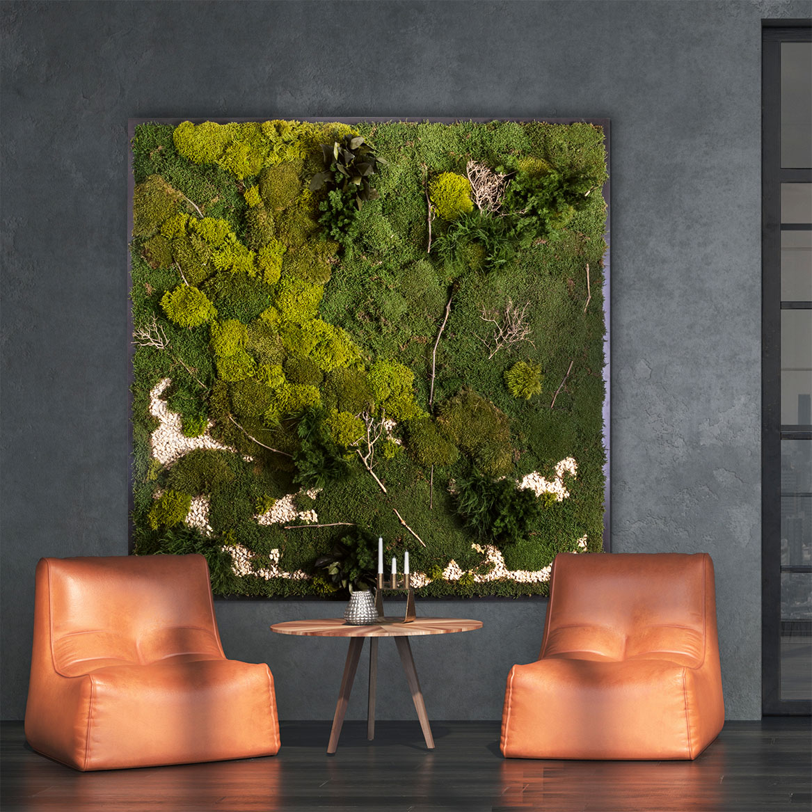 Stress minimieren, Wohlbefinden steigern und zurück zur inneren Balance finden. Mit unseren gigantischen Moosbild erzeugen Sie in Ihrem Zuhause einen einzigartigen Naturcharakter und profitieren so positiv von seiner natürlichen Ausstrahlung. Egal ob im heimischen Wohnzimmer, als Designelement in Ihrer Praxis oder als stylisches Highlight in Ihrem Büro: Das zeitlose Design passt zu jedem Einrichtungsstil. Unser Moosbild aus Pflanzenmoos verhilft außerdem zu einem angenehmen Raumklima, verbessert die Raumakustik und bringt die Ruhe der Natur in Ihre Vier Wände.