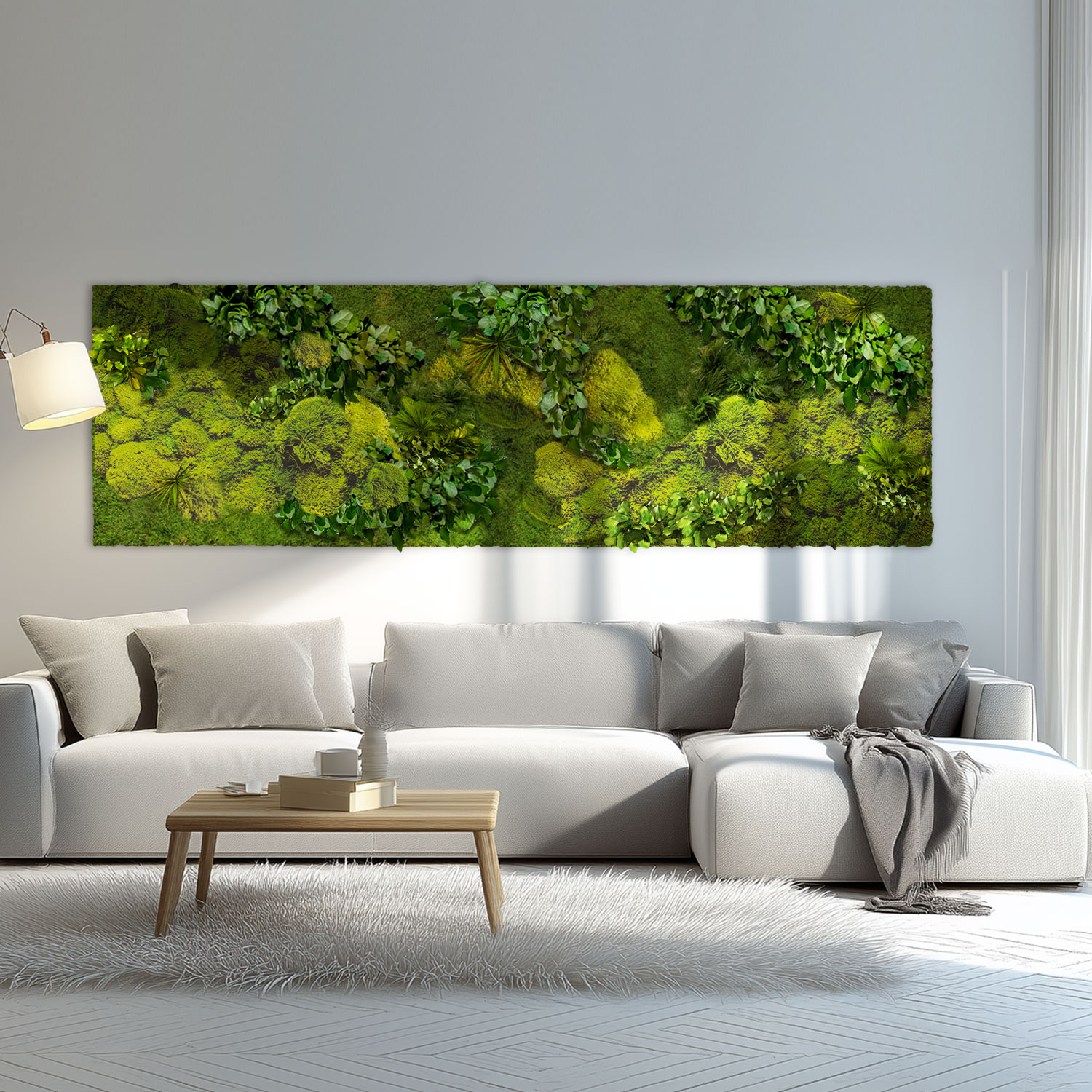 Erleben Sie mit Green Horizon ein außergewöhnliches Moosbild, das Ruhe, Natürlichkeit und modernes Design in perfekter Harmonie verbindet. Dieses exklusive Naturbild zur Wandbegrünung kombiniert hochwertiges Waldmoos und samtiges Bärenfellmoos mit sorgfältig arrangierten grünen Pflanzen. Die organische, schwungvolle Linienführung erinnert an sanfte Landschaften und natürliche Horizonte – ein echtes Highlight der vertikalen Begrünung. Green Horizon bringt die Kraft des Waldes direkt in Ihre Innenräume – ganz ohne Pflege. Dank professioneller Konservierung bleibt das Moos dauerhaft frisch, farbintensiv und wirkt schallabsorbierend sowie raumklimafördernd. Ob im Wohnzimmer, Büro oder Empfangsbereich: Dieses pflegefreie Moosbild verwandelt jede Wand in ein natürliches Kunstwerk.