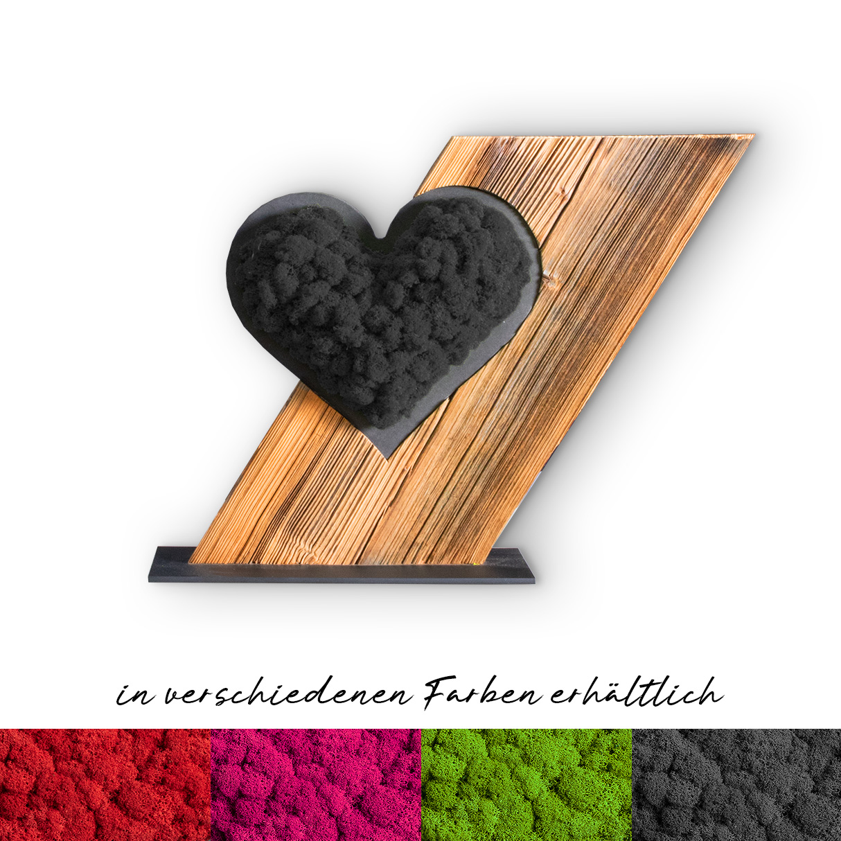 Flauschig weiches Islandmoos in der Farbe der Liebe, behutsam auf eine hochwertige Holzfaserplatte aufgebracht mit einem einzigartigen Standfuß aus Altholz.