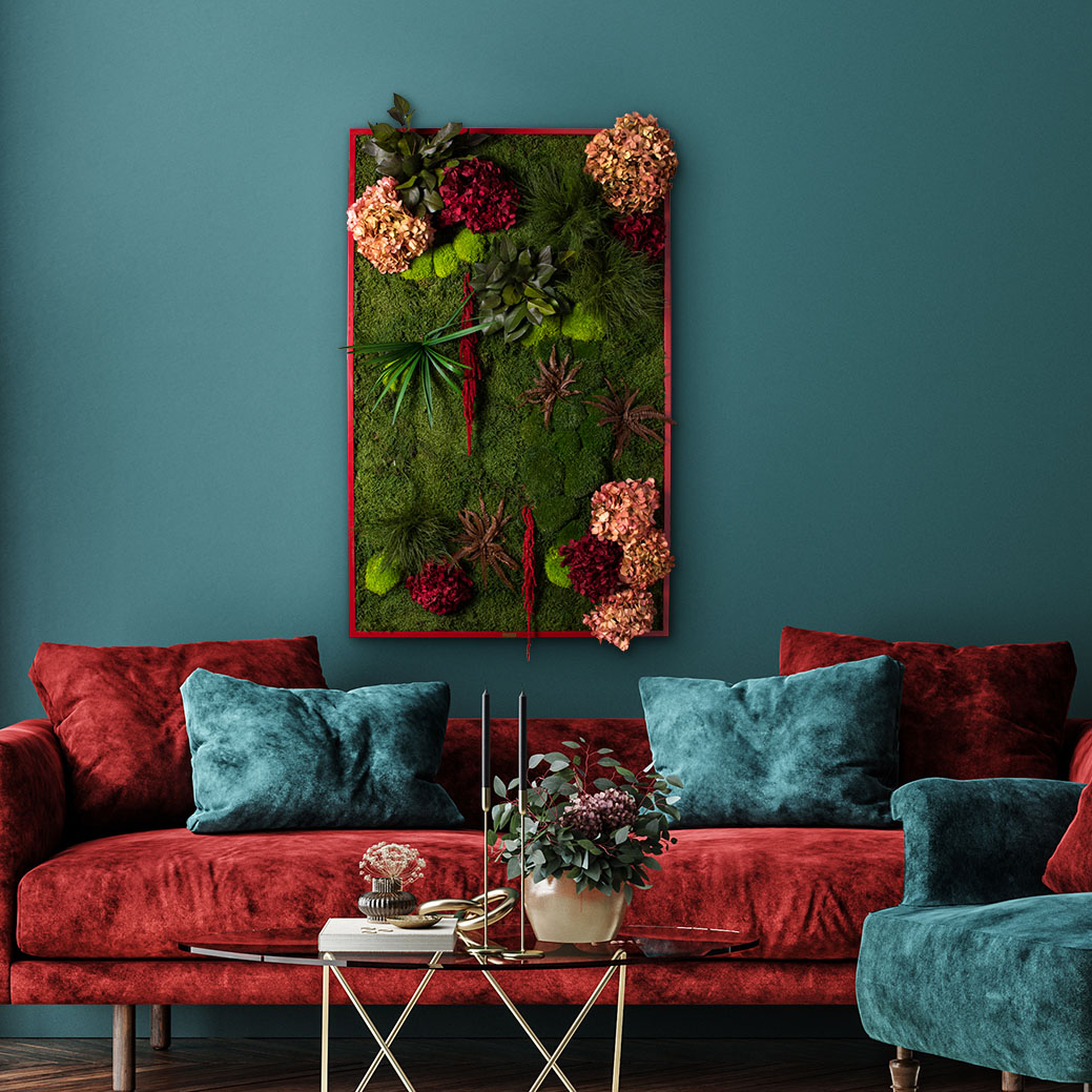 Moosbild Pflanzen & Hortensien mit rotem Tischlerrahmen