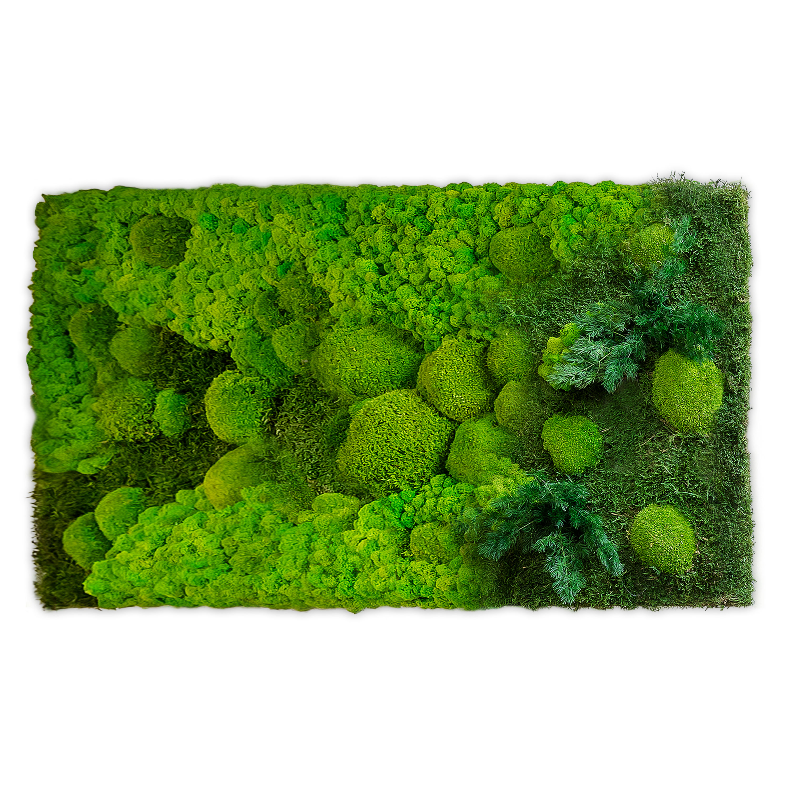 Unser Moosbild "Tripple Moosmix" überzeugt durch einen harmonischen Verlauf von Island-, Wald- und Ballenmoos. Zusätzlich zieren passende Pflanzenelemente das Moosbild.