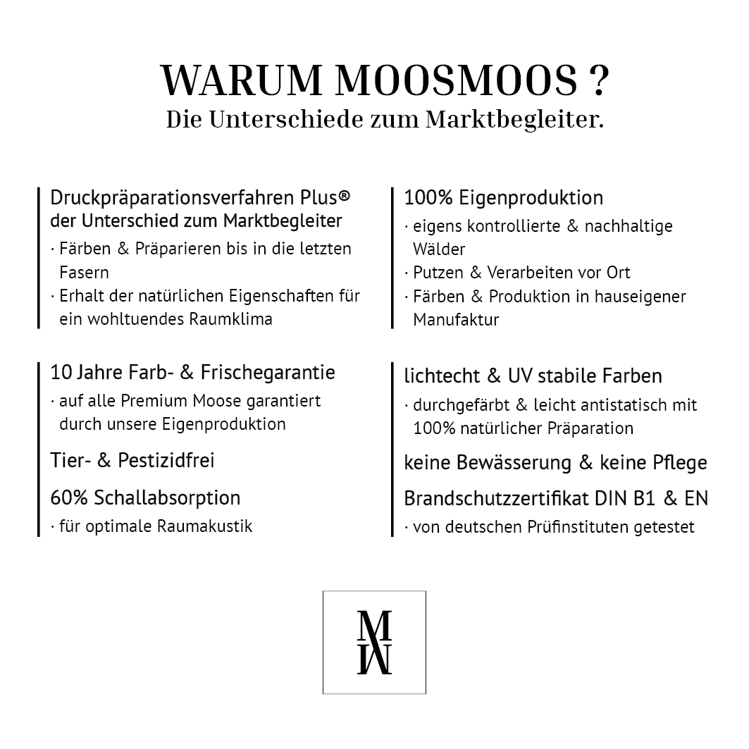 Bei uns wird das Moos bis in die letzte Faser gefärbt und präpariert. Marktbegleiter hingegen besprühen oder lackieren ihre Moose lediglich. Durch dieses Verfahren erhalten wir die einzigartigen Eigenschaften der Moose wie z.B. die Luftfeuchtigkeitsregulierung. Das Moos kann weiterhin Feuchtigkeit aufnehmen und diese bei einem trockenen Raumklima wieder abgeben - wie in der Natur. Das sorgt für ein optimales, natürliches Raumklima welches sich stressreduzierend und wohltuend auswirkt.
