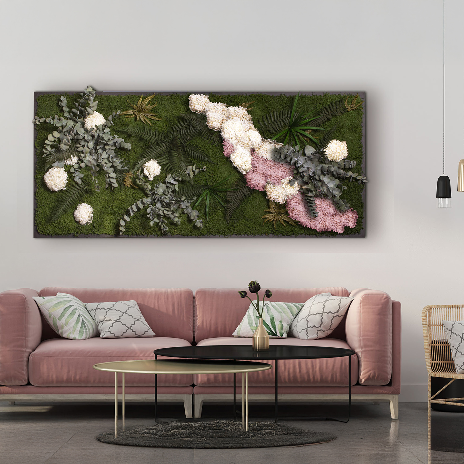 Unsere Moosbilder mit Akzenten aus farbenfrohen Hortensien verleihen Ästhetik und Eleganz. Eine vollendete Perfektion für ein elegantes und luxuriöses Interior Design.