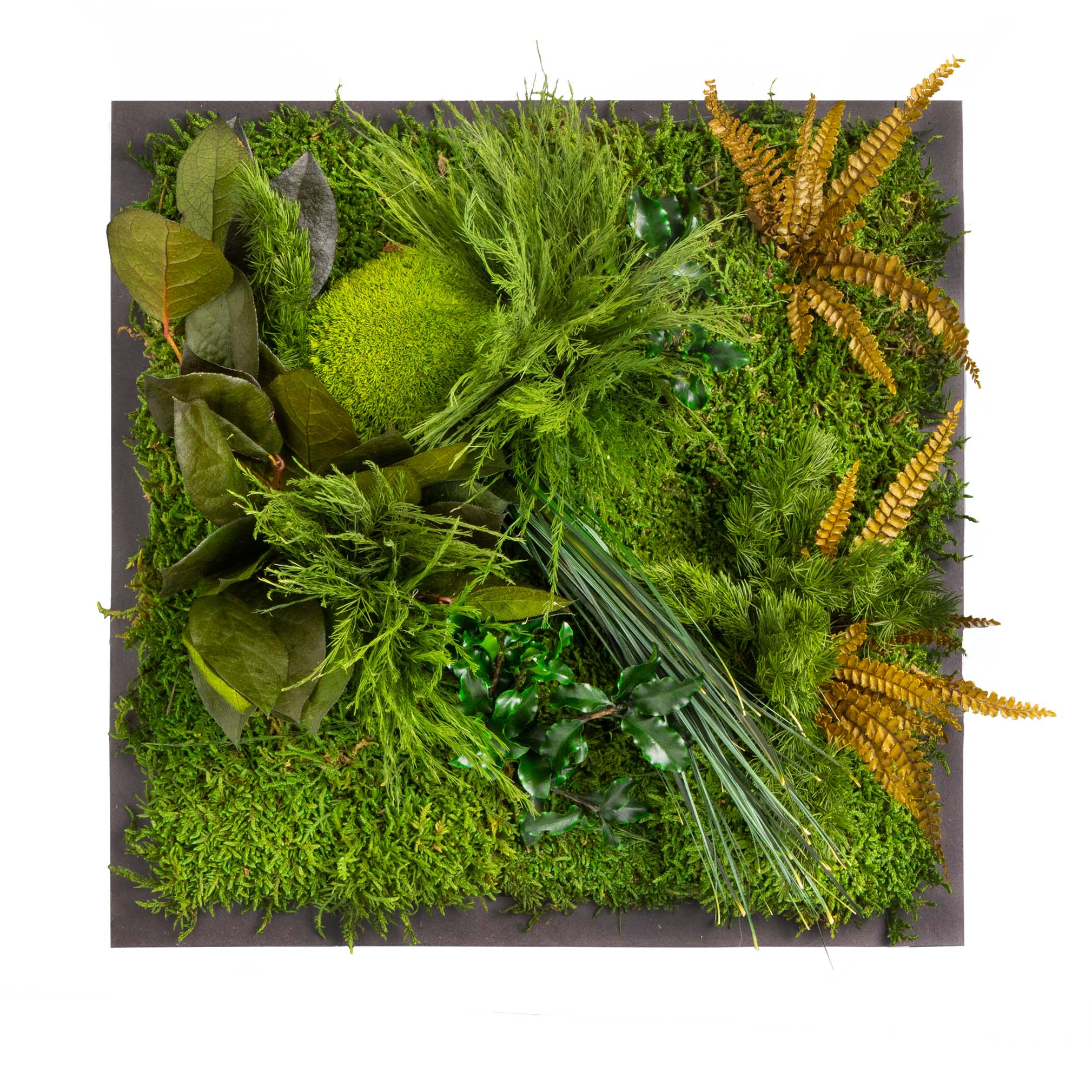 Unsere Moosbilder Dschungel zeichnen sich durch eine üppige Aneinanderreihung verschiedener echter, konservierter Pflanzen aus. Aus einer Vielzahl von Gräsern, Sträuchern und Blattwerken, wird eine Pflanzenkomposition geschaffen welches einer Expedition durch den Dschungel gleicht.