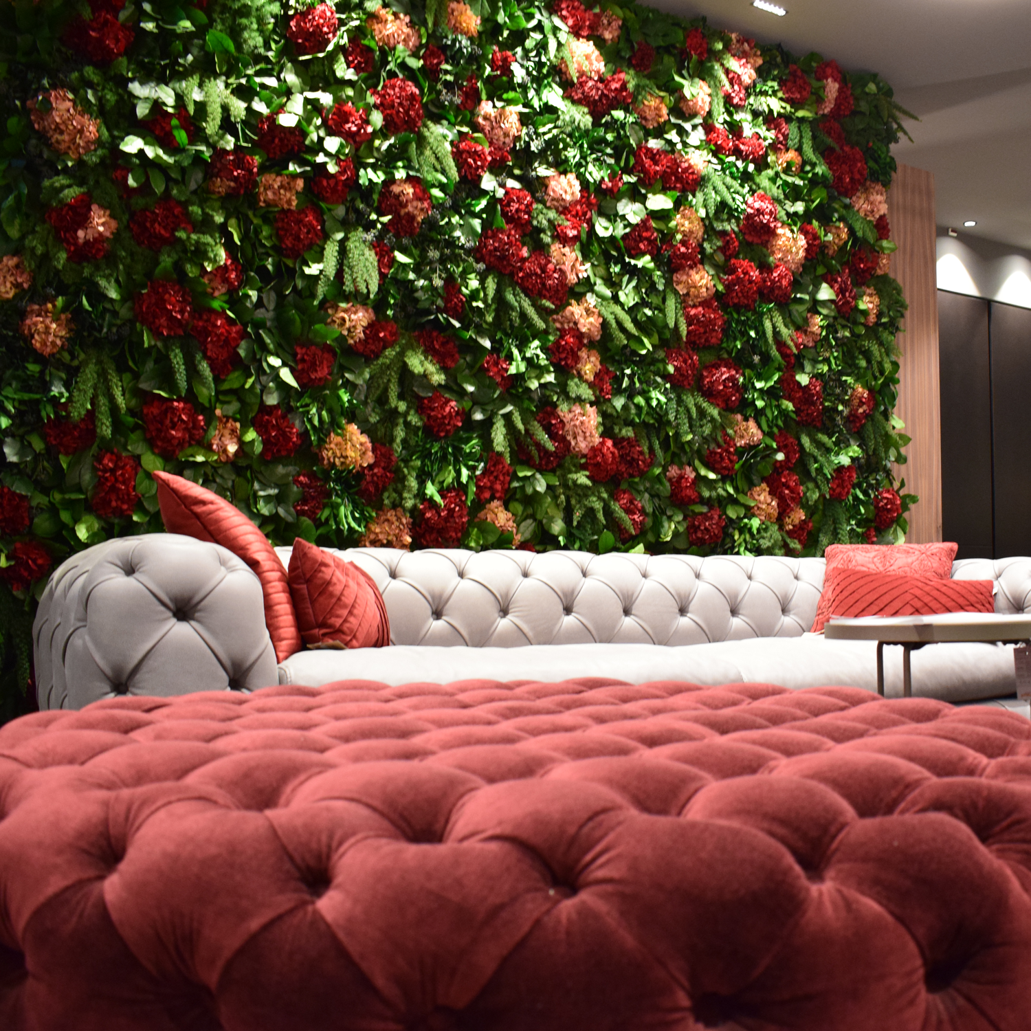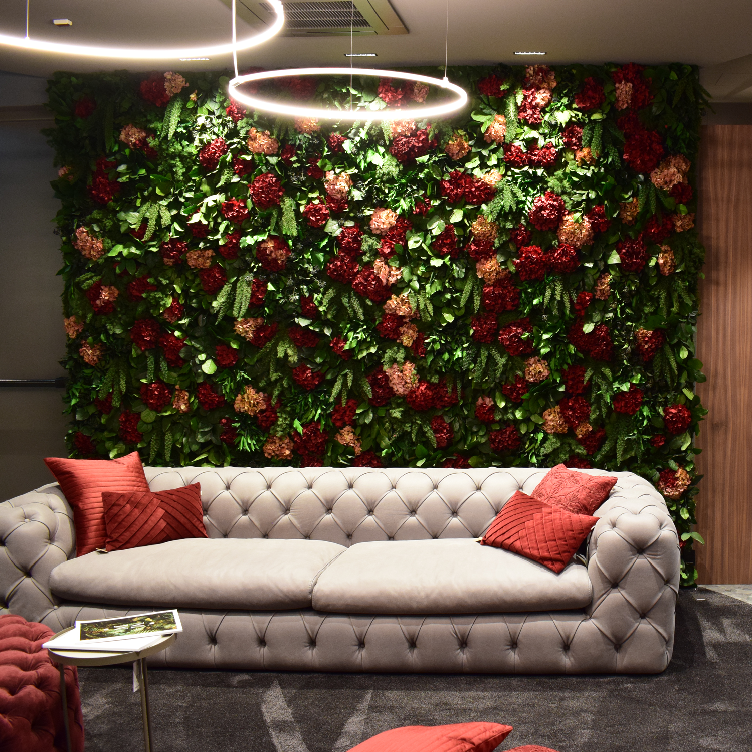 Diese exklusive Mooswand vereint die Schönheit von naturbelassenem Dschungelmoos und luxuriösen Hortensienblüten in einem einzigartigen Design, das jedem großen und offenen Raum eine edle Note verleiht. Die satten Rottöne der Hortensien bilden zusammen mit den bicolor natural creme / pink Farbtönen einen faszinierenden Kontrast und sorgen für eine lebendige, aber gleichzeitig harmonische Optik. Das hochwertige Dschungelmoos bringt Frische und Natürlichkeit in Ihre Umgebung und schafft eine Atmosphäre, die an einen exotischen Dschungel erinnert. Die sorgfältige Handarbeit und die erstklassigen Materialien garantieren eine langlebige und pflegeleichte Wanddekoration, die durch ihre natürliche Eleganz besticht und jeden Raum zum luxuriösen Hingucker macht. Perfekt, um Wohnräume, Büros oder Empfangsbereiche auf eindrucksvolle Weise aufzuwerten.