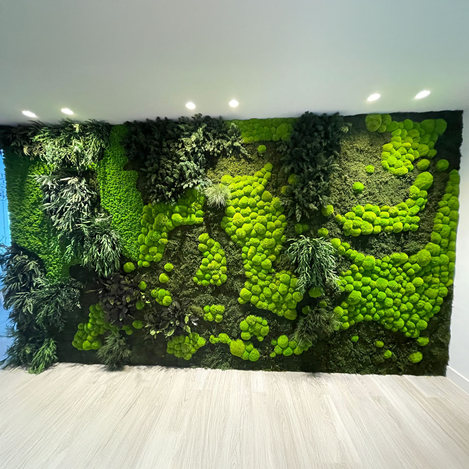 Jede Mooswand wird individuell gefertigt und passt sich nahtlos an Ihre Räumlichkeiten an – von modernen Wohnbereichen über gemütliche Schlafzimmer bis hin zu repräsentativen Büros. Die Kombination aus natürlichen Elementen und elegantem Design bringt nicht nur Ruhe und Balance in Ihre Räume, sondern setzt auch stilvolle Akzente, die Ihre Einrichtung perfekt ergänzen. Erleben Sie, wie die natürliche Ästhetik dieser einzigartigen Wandgestaltung ein Gefühl von Frische und Lebendigkeit in Ihr Zuhause oder Ihren Arbeitsplatz bringt – ein echter Blickfang, der für Staunen sorgt.